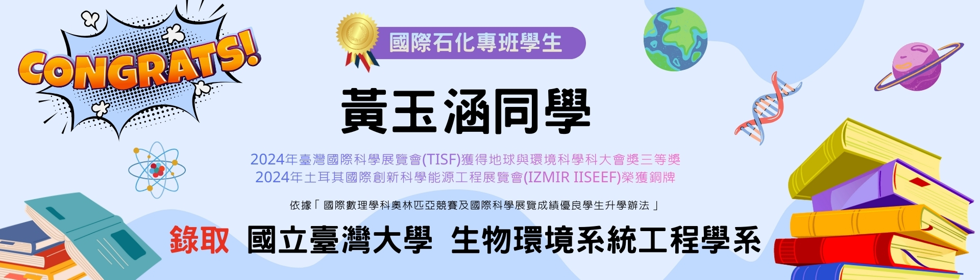 | 2025-12-11 | 狂賀恭賀501吳O芳、504高O呈參加114年度英文書籍簡介暨心得比賽獲獎,指導老師黃柏森師 | 榮譽事蹟 | 圖書服務組 | 24 |