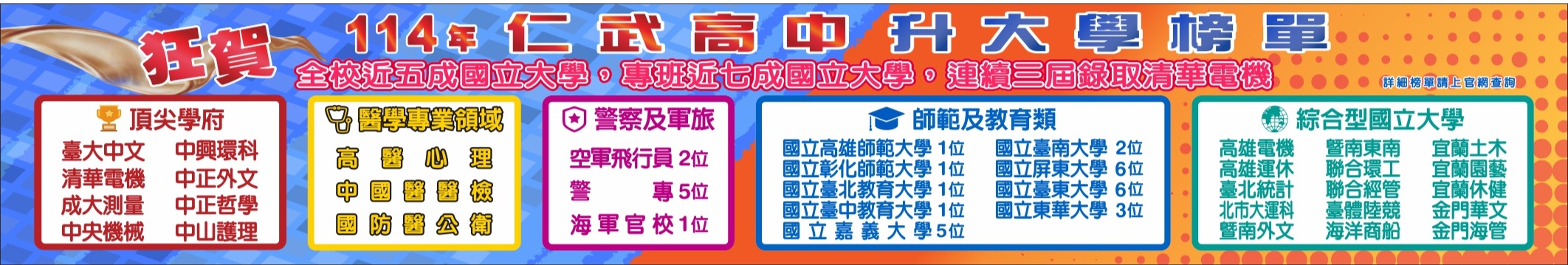 鍵盤操作說明 收合式 (Accordion) 鍵盤操作說明 (左方向鍵) 或 (上方向鍵) : 上一個問題。 (右方向鍵) 或 (下方向鍵) : 下一個問題。 Enter 或 Space : 開啟或收合答案區。 Tab : 移至答案區內的下一個連結 ( link ),若答案區內無連結,則移至下一個問題。 Shift + Tab : 移至答案區內的上一個連結 ( link ),若答案區內無連結,則移至上一個問題。 114年大學繁星金榜 請以左、右方向鍵切換各問題,Enter 鍵展開/收合答案 🎉 114學年度繁星推薦金榜題名!全體錄取同學榮耀合影! 🎉 🏆 114學年度大學升學金榜!恭賀同學榮登各大學! 🏆 🎓 114學年度升大學錄取名單出爐!升學成果亮眼!