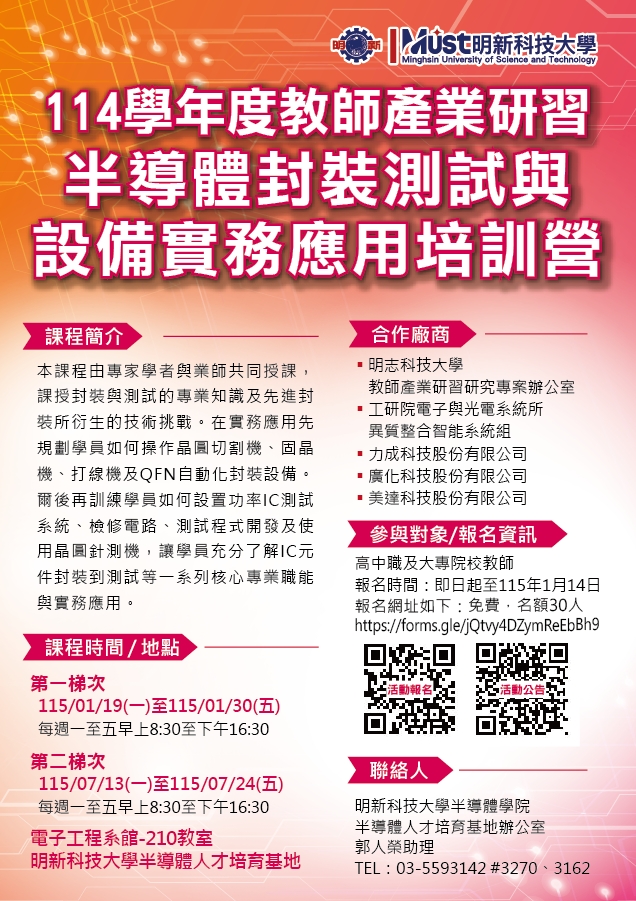 校園資訊 公告主旨 「半導體封裝測試與設備實務應用」培訓課程 發佈日期 2026 年 1 月 20 日 發佈單位 實研組 公告類別 研習資訊 公告等級 無 點閱次數 53 公告內容 相關附件 「半導體封裝測試與設備實務應用」培訓課程1 「半導體封裝測試與設備實務應用」培訓課程1 檔案名稱檔案大小檔案格式下載「半導體封裝測試與設備實務應用」培訓課程1.pdf272.72 KB新視窗開啟檔案「半導體封裝測試與設備實務應用」培訓課程2.pdf226.78 KB新視窗開啟檔案 「半導體封裝測試與設備實務應用」培訓課程1.pdf「半導體封裝測試與設備實務應用」培訓課程2.pdf 「半導體封裝測試與設備實務應用」培訓課程3 「半導體封裝測試與設備實務應用」培訓課程3 檔案名稱檔案大小檔案格式下載「半導體封裝測試與設備實務應用」培訓課程3.jpg529.40 KB新視窗開啟檔案 「半導體封裝測試與設備實務應用」培訓課程3.jpg 【2026-01-20】各級學校115年寒假期間學生活動安全注意事項宣導資料 【2026-01-20】社團法人慧治教育協會【收穫經驗,累積成長|學習歷程檔案分享會】