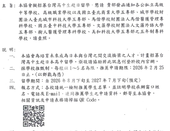 校園資訊 公告主旨 日本台灣交流協會計畫招募台灣高中生赴日本高中留學 發佈日期 2025 年 11 月 26 日 發佈單位 圖書館 公告類別 活動資訊 公告等級 轉知 點閱次數 16 公告內容 相關附件 1126公告 1126公告 檔案名稱檔案大小檔案格式下載1126公告.pdf240.42 KB新視窗開啟檔案 1126公告.pdf 【2025-11-26】高雄市立仁武高級中學約僱職務代理人職缺(須具身心障礙證明)面試 ... 【2025-11-26】轉知國立臺灣藝術教育館辦理114年度「藝起來尋美―教育部推動國民 ...