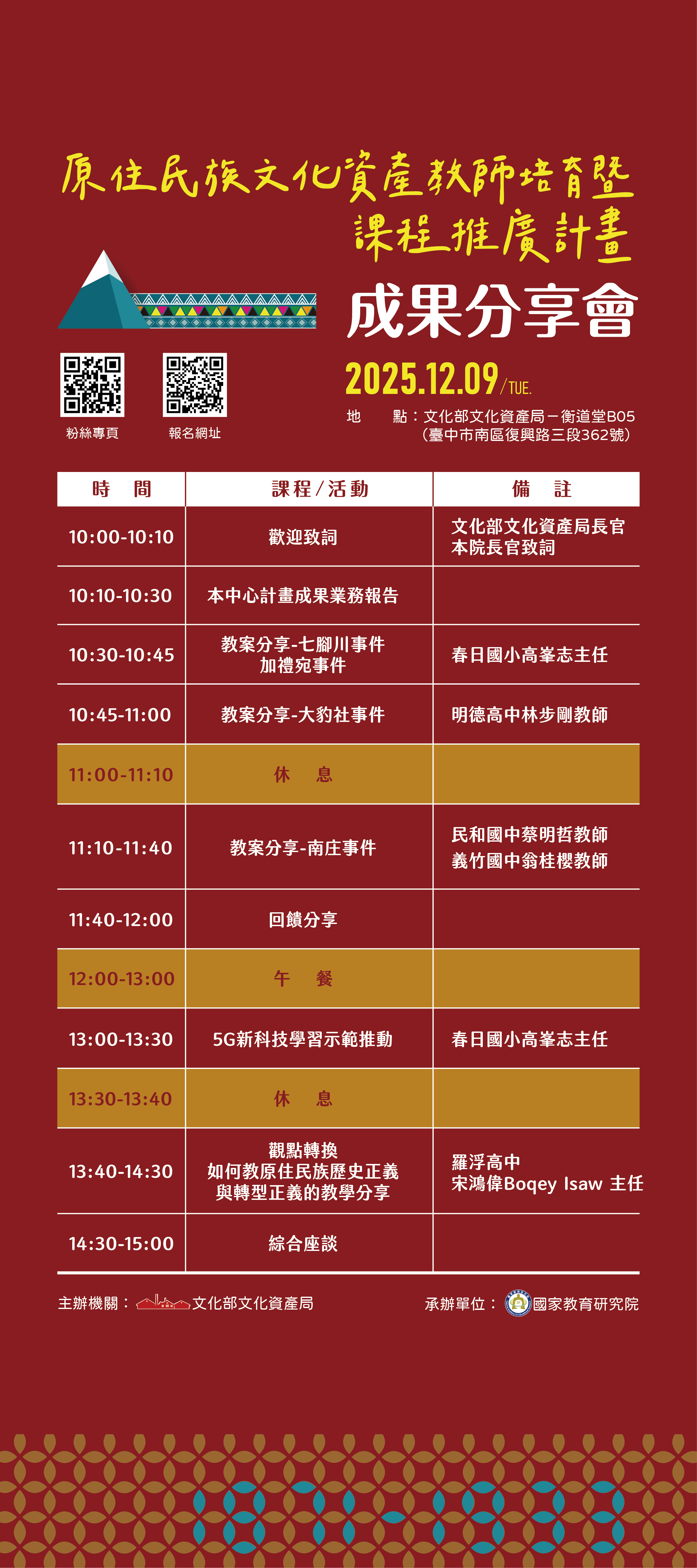 校園資訊 公告主旨 有關國家教育研究院辦理「原住民族文化資產教師培育暨推廣課程計畫」成果分享會 發佈日期 2025 年 11 月 29 日 發佈單位 教學組 公告類別 研習資訊 公告等級 無 點閱次數 71 公告內容 相關附件 有關國家教育研究院辦理「原住民族文化資產教師培育暨推廣課程計畫」成果分享會 有關國家教育研究院辦理「原住民族文化資產教師培育暨推廣課程計畫」成果分享會 檔案名稱檔案大小檔案格式下載有關國家教育研究院辦理「原住民族文化資產教師培育暨推廣課程計畫」成果分享會.png602.97 KB新視窗開啟檔案有關國家教育研究院辦理「原住民族文化資產教師培育暨推廣課程計畫」成果分享會.pdf202.65 KB新視窗開啟檔案 有關國家教育研究院辦理「原住民族文化資產教師培育暨推廣課程計畫」成果分享會.png有關國家教育研究院辦理「原住民族文化資產教師培育暨推廣課程計畫」成果分享會.pdf 【2025-11-29】地理學科中心舉辦114學年度第十九屆全國高中社會領域素養導向評 ... 【2025-11-29】檢送普通型高級中等學校生物學科中心114學年度全國生物科教師增 ...