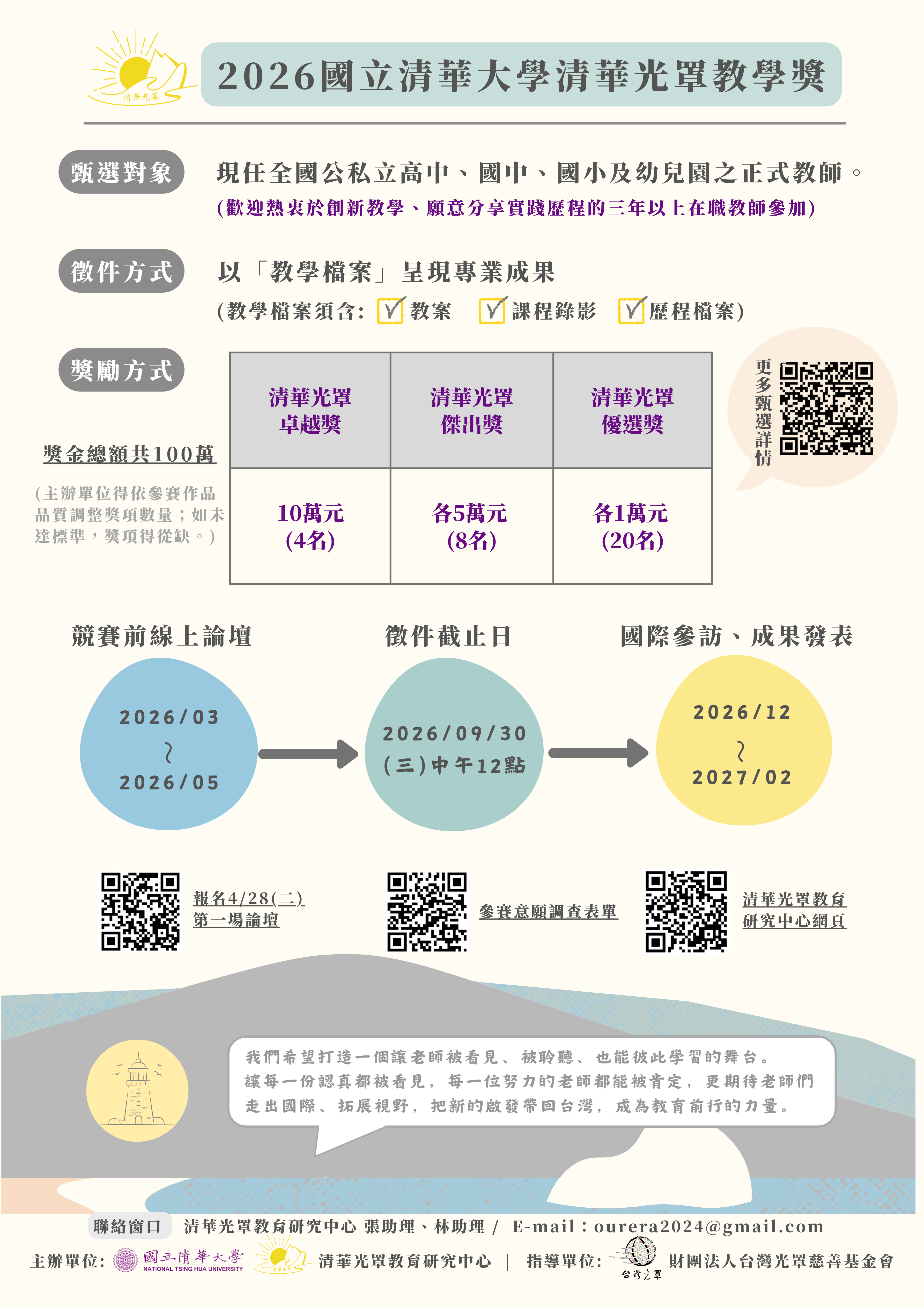 校園資訊 公告主旨 本校清華光罩教育研究中心辦理「2026國立清華大學清華光罩教學獎」甄選 發佈日期 2026 年 4 月 17 日 發佈單位 教學組 公告類別 研習資訊 公告等級 無 點閱次數 15 公告內容 相關附件 本校清華光罩教育研究中心辦理「2026國立清華大學清華光罩教學獎」甄選-2 本校清華光罩教育研究中心辦理「2026國立清華大學清華光罩教學獎」甄選-2 檔案名稱檔案大小檔案格式下載本校清華光罩教育研究中心辦理「2026國立清華大學清華光罩教學獎」甄選-2.png1.65 MB新視窗開啟檔案本校清華光罩教育研究中心辦理「2026國立清華大學清華光罩教學獎」甄選-1.pdf961.34 KB新視窗開啟檔案 本校清華光罩教育研究中心辦理「2026國立清華大學清華光罩教學獎」甄選-2.png本校清華光罩教育研究中心辦理「2026國立清華大學清華光罩教學獎」甄選-1.pdf 【2026-04-17】本校清華光罩教育研究中心辦理「2026國立清華大學清華光罩教學獎 ... 【2026-04-17】函轉國立臺灣工藝研究發展中心辦理「織築有餘・編織教師培力工作 ...