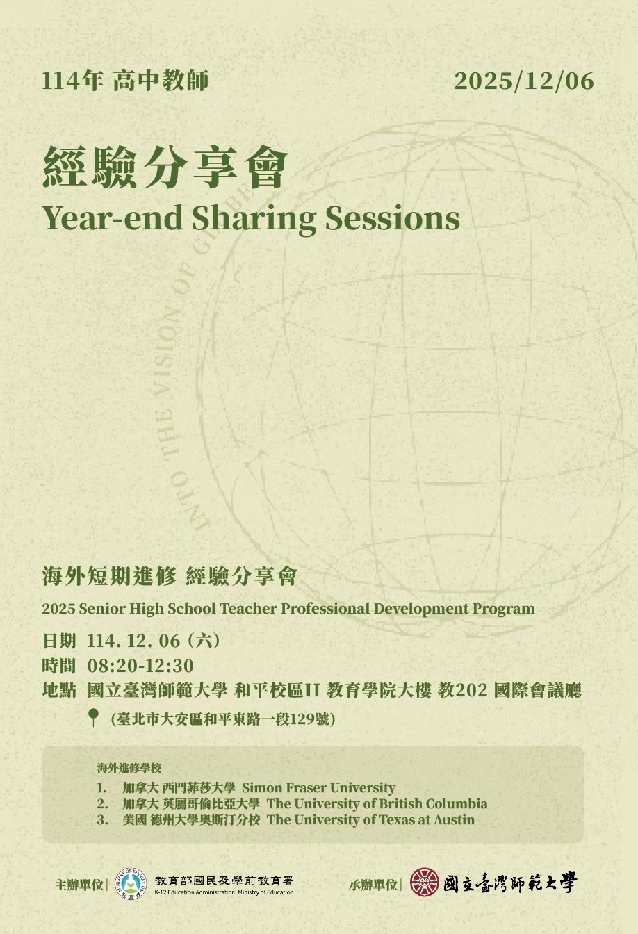 校園資訊 公告主旨 檢送「114年選送高級中等學校教師海外短期進修」經驗分享會資訊1份 發佈日期 2025 年 11 月 25 日 發佈單位 教學組 公告類別 研習資訊 公告等級 無 點閱次數 18 公告內容 相關附件 檢送「114年選送高級中等學校教師海外短期進修」經驗分享會資訊1份-2 檢送「114年選送高級中等學校教師海外短期進修」經驗分享會資訊1份-2 檔案名稱檔案大小檔案格式下載檢送「114年選送高級中等學校教師海外短期進修」經驗分享會資訊1份-2.jpg261.83 KB新視窗開啟檔案檢送「114年選送高級中等學校教師海外短期進修」經驗分享會資訊1份-1.pdf281.96 KB新視窗開啟檔案 檢送「114年選送高級中等學校教師海外短期進修」經驗分享會資訊1份-2.jpg檢送「114年選送高級中等學校教師海外短期進修」經驗分享會資訊1份-1.pdf 【2025-11-25】檢送教育部國民及學前教育署普通型高級中等學校藝術生活學科中心 ... 【2025-11-25】函轉國立臺灣師範大學辦理「『領航20,智慧未來』普高工作圈及學 ...