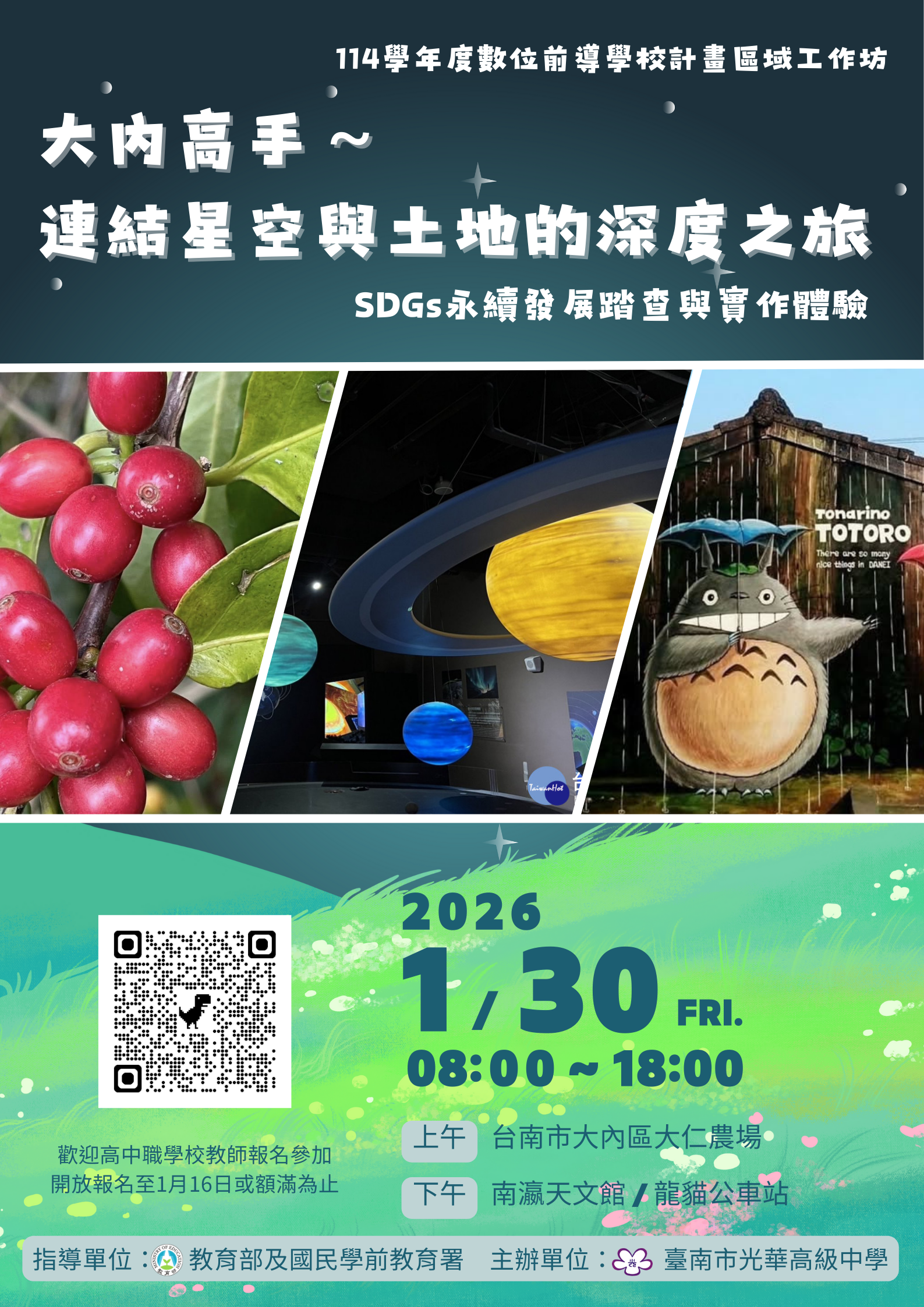 校園資訊 公告主旨 檢送本校114學年度前導學校區域教師工作坊「SDGs永續發展踏查與實作體驗─大內高手~連結星空與土地的深度之旅」實施計畫 發佈日期 2026 年 1 月 06 日 發佈單位 教學組 公告類別 活動資訊 公告等級 無 點閱次數 49 公告內容 相關附件 檢送本校114學年度前導學校區域教師工作坊「SDGs永續發展踏查與實作體驗─大內高手~連結星空與土地的深度之旅」實施計畫-2 檢送本校114學年度前導學校區域教師工作坊「SDGs永續發展踏查與實作體驗─大內高手~連結星空與土地的深度之旅」實施計畫-2 檔案名稱檔案大小檔案格式下載檢送本校114學年度前導學校區域教師工作坊「SDGs永續發展踏查與實作體驗─大內高手~連結星空與土地的深度之旅」實施計畫-2.png4.37 MB新視窗開啟檔案檢送本校114學年度前導學校區域教師工作坊「SDGs永續發展踏查與實作體驗─大內高手~連結星空與土地的深度之旅」實施計畫-1.pdf230.00 KB新視窗開啟檔案 檢送本校114學年度前導學校區域教師工作坊「SDGs永續發展踏查與實作體驗─大內高手~連結星空與土地的深度之旅」實施計畫-2.png檢送本校114學年度前導學校區域教師工作坊「SDGs永續發展踏查與實作體驗─大內高手~連結星空與土地的深度之旅」實施計畫-1.pdf 【2026-01-06】人權教育資源中心辦理114學年度「白恐不迷路地圖在地篇分享會—第 ... 【2026-01-04】函轉教育部製作「寒假親子共學反毒學習單」