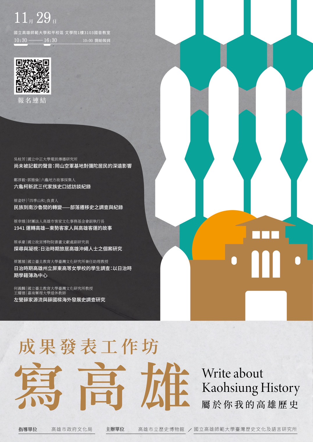 校園資訊 公告主旨 檢送本館辦理2025「寫高雄-屬於你我的高雄歷史」學術成果發表工作坊議程及報名資訊乙份 發佈日期 2025 年 10 月 30 日 發佈單位 教學組 公告類別 研習資訊 公告等級 無 點閱次數 9 公告內容 相關附件 檢送本館辦理2025「寫高雄-屬於你我的高雄歷史」學術成果發表工作坊議程及報名資訊乙份,敬請會予公告-2 檢送本館辦理2025「寫高雄-屬於你我的高雄歷史」學術成果發表工作坊議程及報名資訊乙份,敬請會予公告-2 檔案名稱檔案大小檔案格式下載檢送本館辦理2025「寫高雄-屬於你我的高雄歷史」學術成果發表工作坊議程及報名資訊乙份,敬請會予公告-2.jpg274.96 KB新視窗開啟檔案檢送本館辦理2025「寫高雄-屬於你我的高雄歷史」學術成果發表工作坊議程及報名資訊乙份,敬請會予公告-1.pdf178.97 KB新視窗開啟檔案 檢送本館辦理2025「寫高雄-屬於你我的高雄歷史」學術成果發表工作坊議程及報名資訊乙份,敬請會予公告-2.jpg檢送本館辦理2025「寫高雄-屬於你我的高雄歷史」學術成果發表工作坊議程及報名資訊乙份,敬請會予公告-1.pdf 【2025-10-30】檢送普通型高級中等學校音樂學科中心辦理「114學年度區域策略聯 ... 【2025-10-30】有關114學年度教學輔導教師換證實施計畫