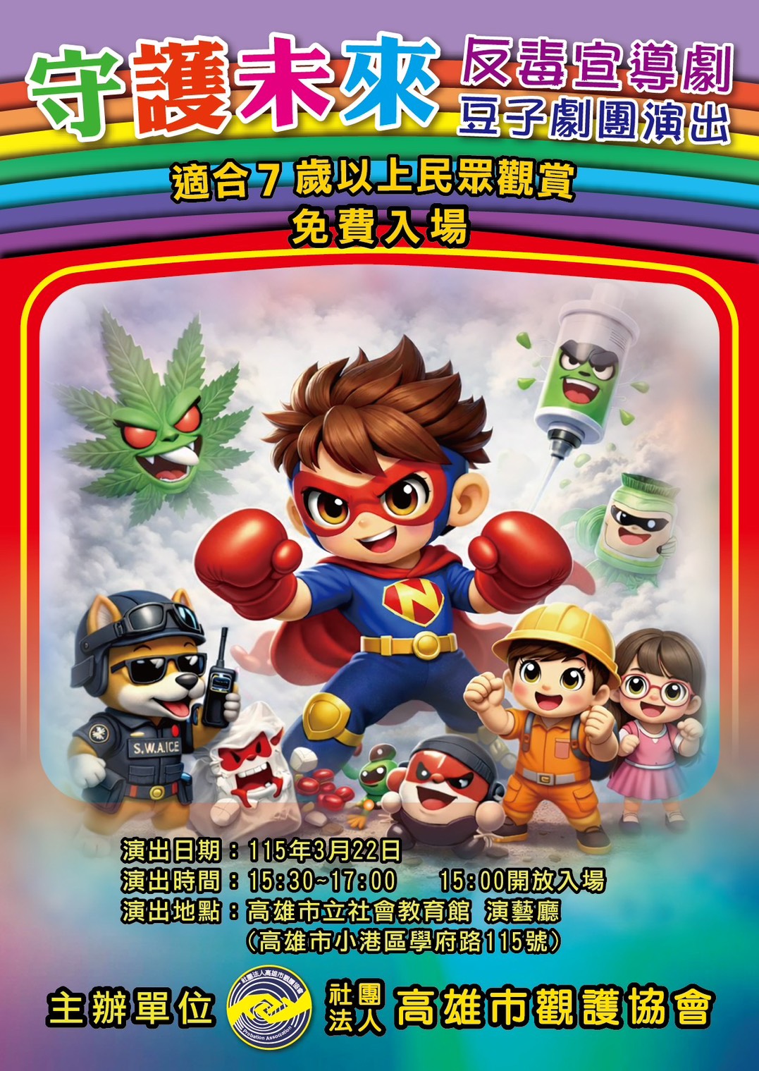 | 公告內容 | 一、旨揭活動係由社團法人高雄市觀護協會辦理,透過豆子劇團生動有趣的「守護未來—校園反毒巡迴劇」傳達反毒觀念,提升師生與家庭的防毒意識。 |