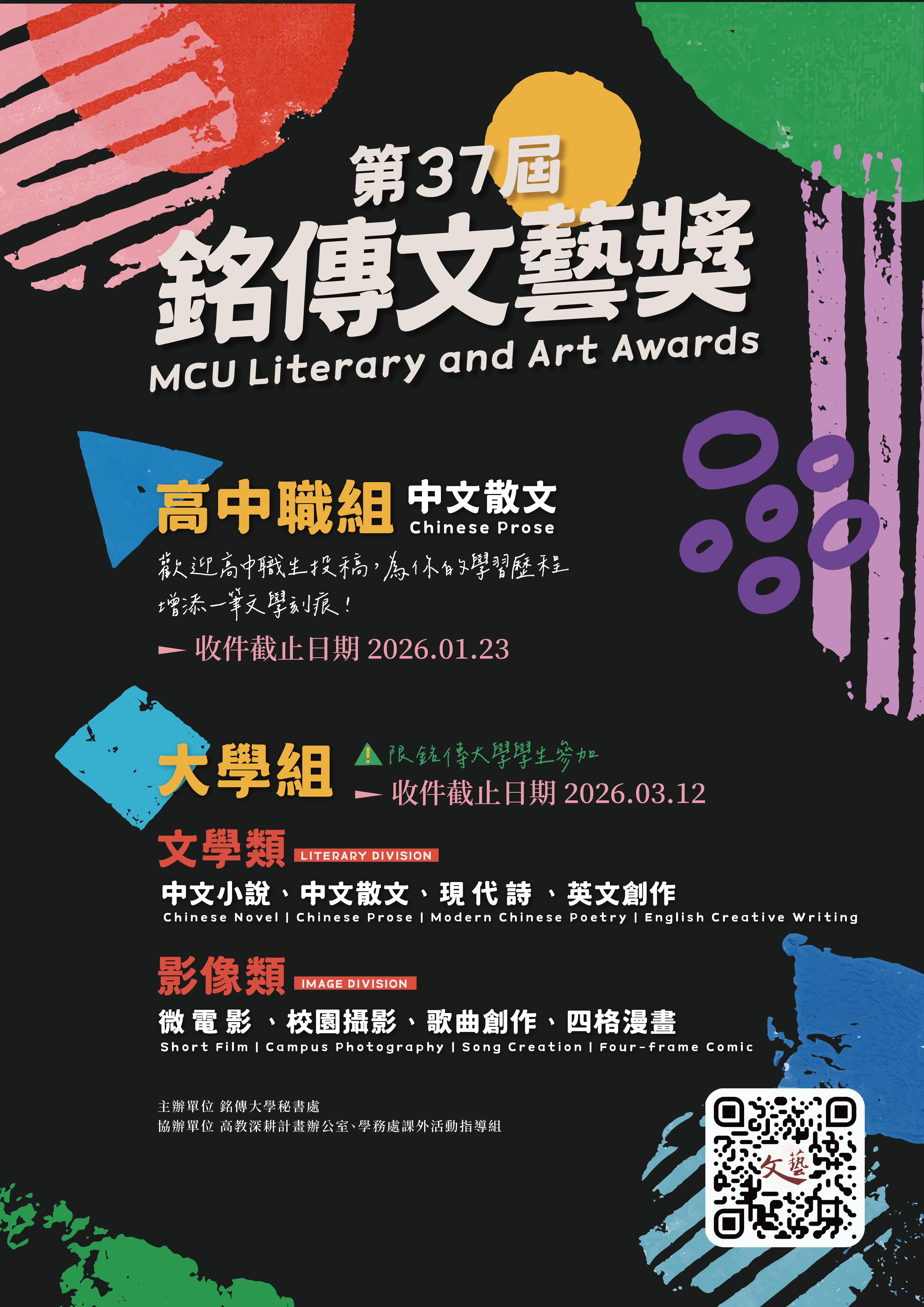 校園資訊 公告主旨 銘傳文藝獎 發佈日期 2025 年 11 月 01 日 發佈單位 圖書服務組 公告類別 活動資訊 公告等級 無 點閱次數 12 公告內容 意者請自行報名參加 相關附件 銘傳文藝獎 銘傳文藝獎 檔案名稱檔案大小檔案格式下載銘傳文藝獎.jpg3.44 MB新視窗開啟檔案 銘傳文藝獎.jpg 【2025-11-01】「ChatGPT與無人機結合之應用」教師增能工作坊 【2025-11-01】華梵學校財團法人華梵大學115學年度「繁星推薦」招生文宣資訊