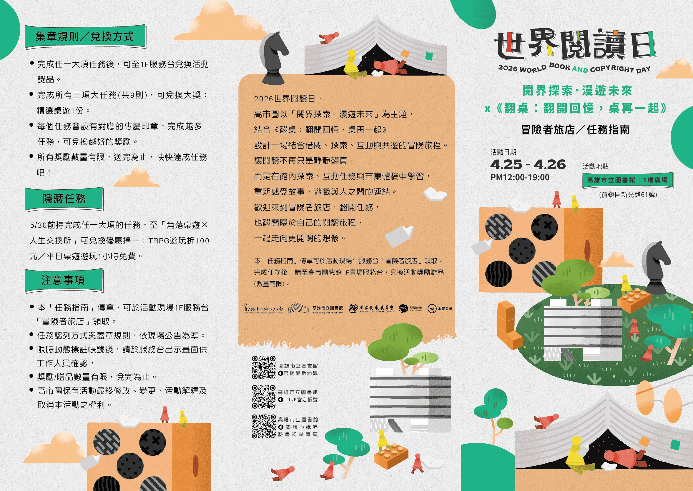 校園資訊 公告主旨 高雄市圖世界閱讀日闖關集點活動 發佈日期 2026 年 4 月 20 日 發佈單位 圖書服務組 公告類別 活動資訊 公告等級 轉知 點閱次數 19 公告內容 相關附件 高雄市立圖書館辦理「2026世界閱讀日」闖關集章活動_DM正面 高雄市立圖書館辦理「2026世界閱讀日」闖關集章活動_DM正面 檔案名稱檔案大小檔案格式下載高雄市立圖書館辦理「2026世界閱讀日」闖關集章活動_DM正面.png2.22 MB新視窗開啟檔案高雄市立圖書館辦理「2026世界閱讀日」闖關集章活動_DM背面.jpg438.89 KB新視窗開啟檔案 高雄市立圖書館辦理「2026世界閱讀日」闖關集章活動_DM正面.png高雄市立圖書館辦理「2026世界閱讀日」闖關集章活動_DM背面.jpg 【2026-04-20】閱讀 x AI 創作競賽 【2026-04-20】2026客委會桐花季三行詩徵選活動