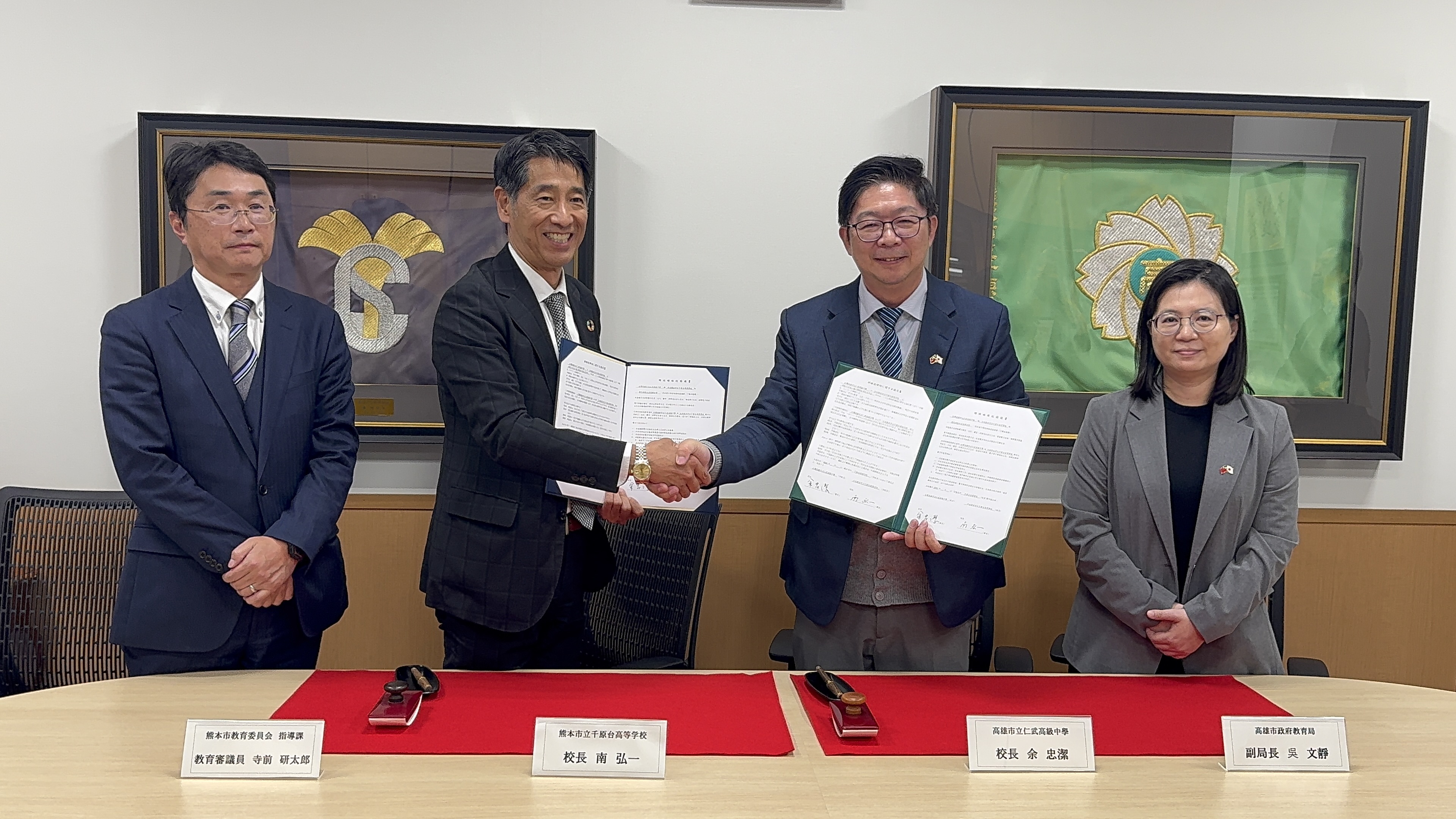 本此余校長最主要的任務是和熊本市優質的千原台高等學校正式簽訂姐妹校的協議,兩校透過半年多的學生交流與行政聯繫籌備,確定趁此次余校長前往熊本市的難得機會簽訂合作協議.1月19日在高雄市教育局吳文靜副局長的見證下,在千原台高校校長會議室,由南弘一校長與本校余忠潔校長正式簽約,為兩校未來深化交流開啟新頁.