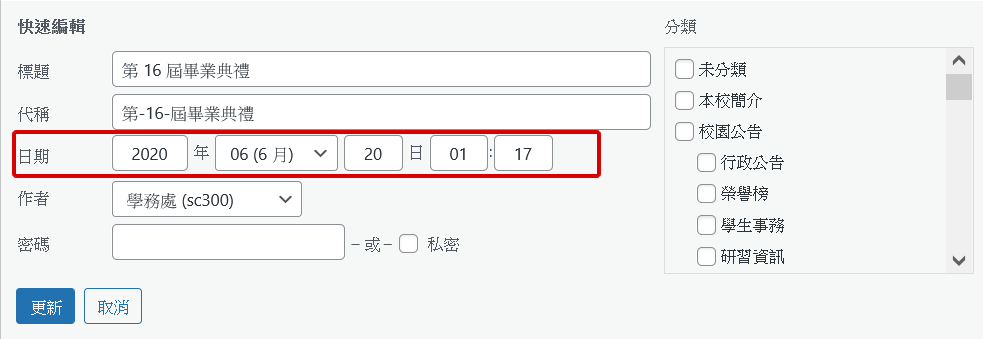 這是系統內建、也是最簡單變更文章順序的方法,只要擁有該文章編輯權限的使用者,就可以更改發佈日期。