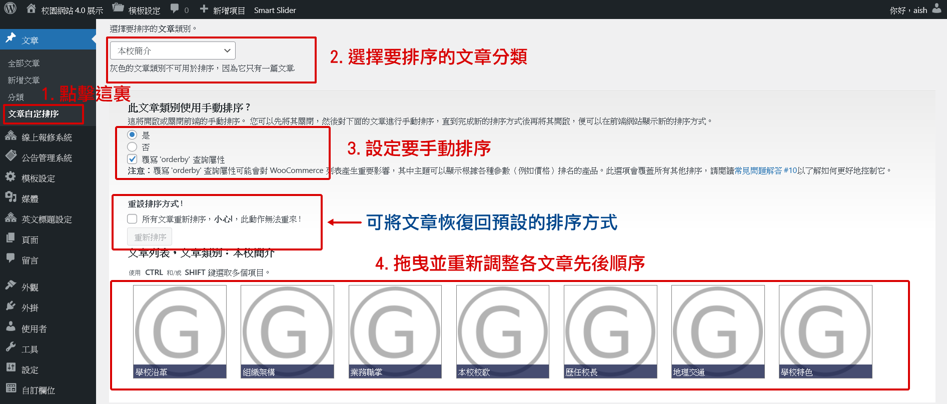 - 點擊左側功能表的 「文章自定排序」。