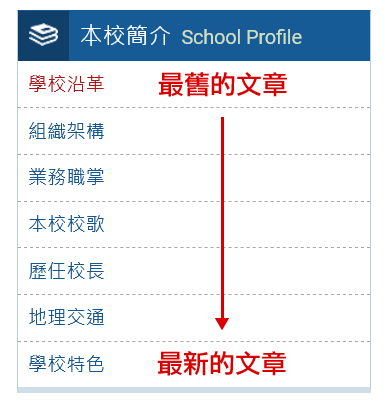 變更文章排序,代表要改變各文章在前台出現的先後順序。預設文章排序的方式,是依照文章發佈日期 「由舊到新」,也就是最早建立的文章在最上面,最新建立的文章則排在最下面。但某些特殊的文章分類,例如 「校園公告」,則會刻意設定反序排列,也就是最新的公告會在最前面。